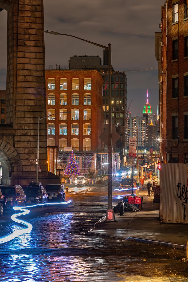 Christmas lights and light trails in DUMBO, Brooklyn