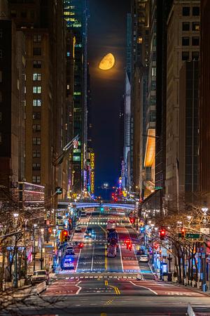 Waxing Gibbous Moon Setting along 42nd Street, Manhattan