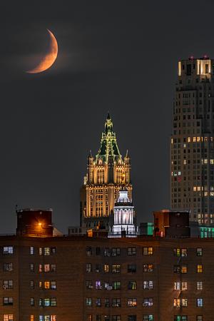 Waxing crescent moonset over the Woolworth Building
